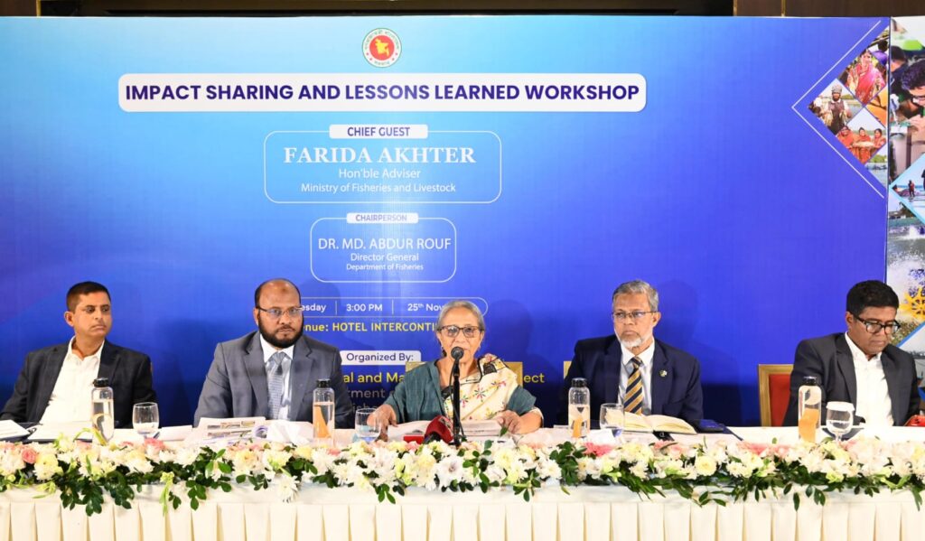 আজ বিকালে রাজধানীর হোটেল ইন্টারকন্টিনেন্টালে মৎস্য অধিদপ্তরের ‘সাসটেইনেবল কোস্টাল অ্যান্ড মেরিন ফিশারিজ’ প্রকল্পের সমাপনী অনুষ্ঠানে প্রধান অতিথির বক্তব্যে তিনি এসব কথা বলেন।