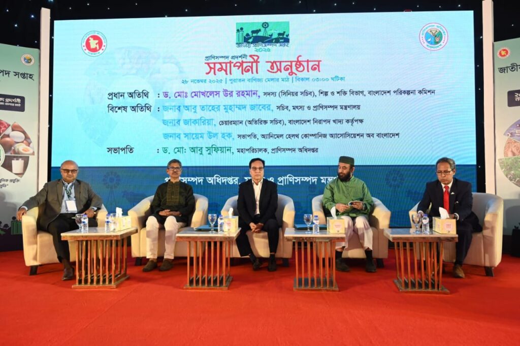 জাতীয় প্রাণিসম্পদ সপ্তাহ ২০২৫ উপলক্ষে আয়োজিত প্রদর্শনীর পুরষ্কার বিতরণ ও মেলার আনুষ্ঠানিক সমাপনী অনুষ্ঠান আজ সন্ধ্যায় পুরাতন বাণিজ্য মেলার মাঠে সেমিনার হলে অনুষ্ঠিত হয়েছে। অনুষ্ঠানে প্রধান অতিথি হিসেবে উপস্থিত ছিলেন বাংলাদেশ পরিকল্পনা কমিশনের সদস্য (সিনিয়র সচিব) ড. মোঃ মোখলেস উর রহমান।