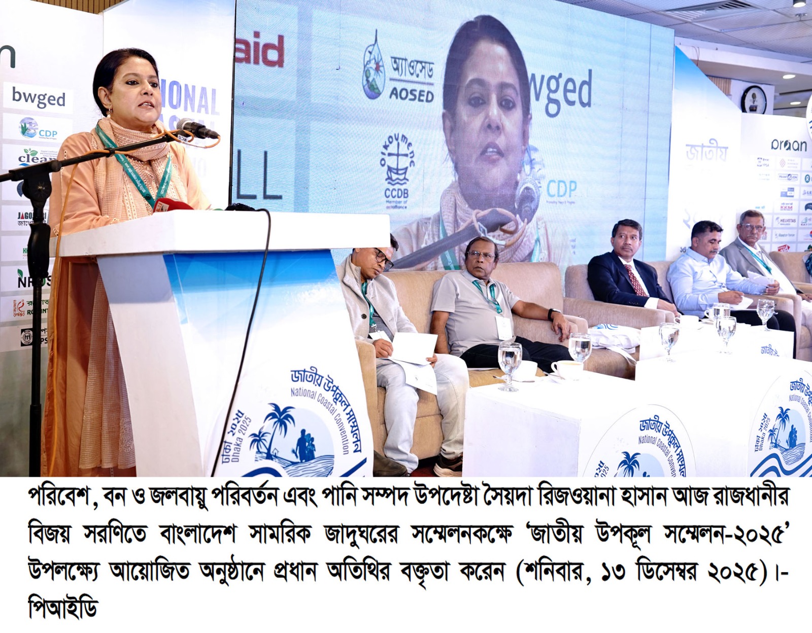 শনিবার রাজধানীর বিজয় সরণিতে বাংলাদেশ সামরিক জাদুঘর মিলনায়তনে দুদিনব্যাপী জাতীয় উপকূল সম্মেলনের উদ্বোধনী অনুষ্ঠানে প্রধান অতিথির বক্তব্যে তিনি বলেন, প্রতিদিন নতুন নতুন দুর্যোগ তৈরি হচ্ছে, প্রাকৃতিক সম্পদ ও কৃষিজমি বিনষ্ট হচ্ছে, খাদ্য নিরাপত্তা হুমকির মুখে পড়ছে এবং বাড়ছে দারিদ্র্য ও পানি সংকট। এর ফলে জলবায়ু উদ্বাস্তু, মাইক্রোপ্লাস্টিক দূষণ এবং কার্বন শোষণ হ্রাসের মতো সংকট আরও তীব্র হচ্ছে।
