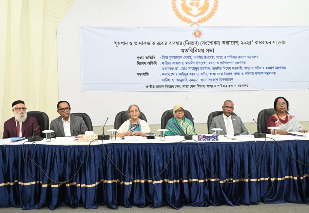 আজ সকালে রাজধানীর সিরডাপ মিলনায়তনে ‘ধূমপান ও তামাকজাত দ্রব্যের ব্যবহার (নিয়ন্ত্রণ) (সংশোধন) অধ্যাদেশ, ২০২৫’ -এর কার্যকর বাস্তবায়ন বিষয়ে এক মতবিনিময় সভায় বিশেষ অতিথির বক্তব্যে এসব কথা বলেন। স্বাস্থ্য ও পরিবার কল্যাণ মন্ত্রণালয়ের স্বাস্থ্য সেবা বিভাগের অধীন জাতীয় তামাক নিয়ন্ত্রণ সেল এ মতবিনিময় সভার আয়োজন করে।