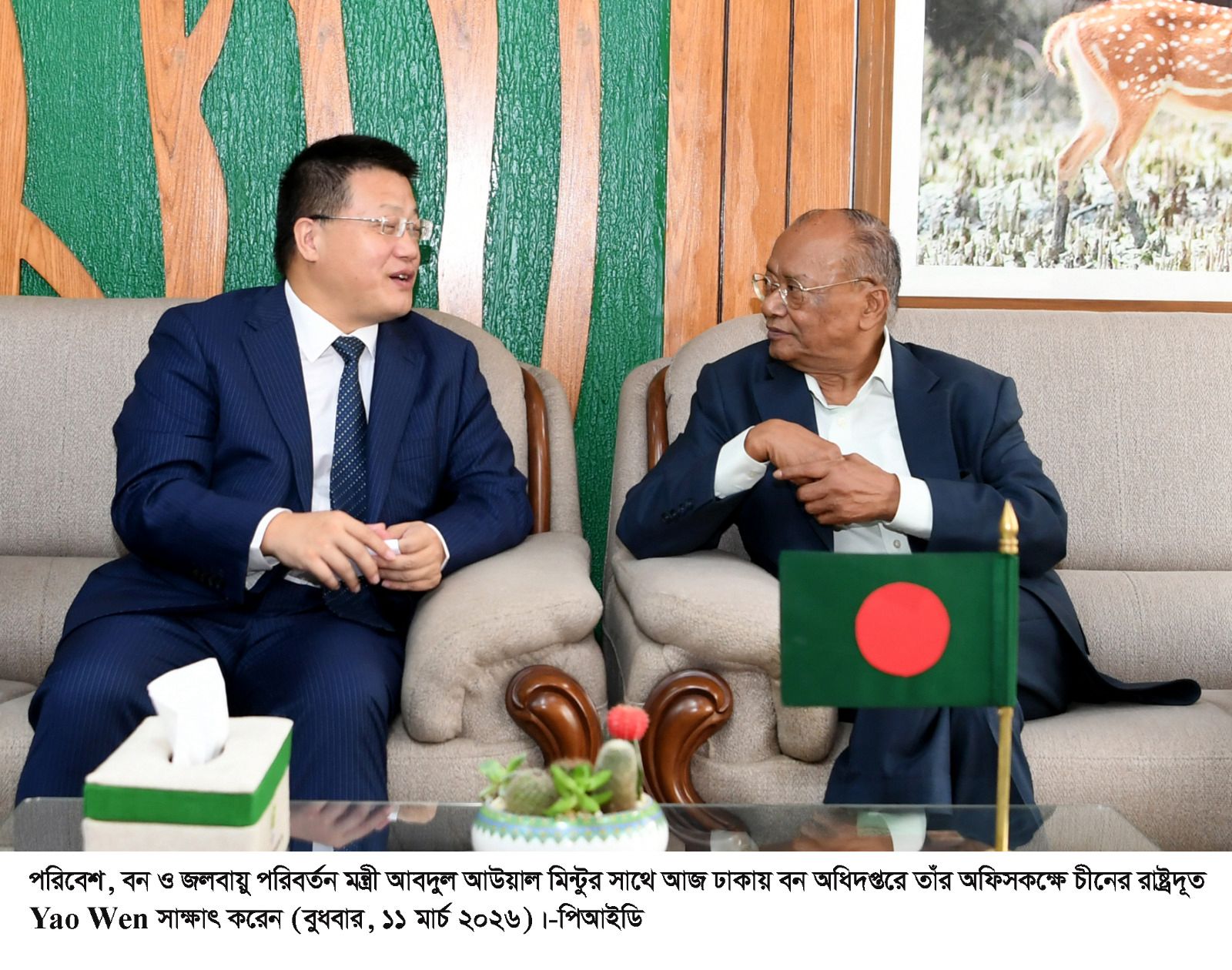 আজ আগারগাঁওস্থ বন অধিদপ্তরে পরিবেশ, বন ও জলবায়ু পরিবর্তন মন্ত্রণালয়ের মন্ত্রী আবদুল আউয়াল মিন্টুর সাথে বাংলাদেশে নিযুক্ত চীনের রাষ্ট্রদূত ইয়াও ওয়েন সৌজন্য সাক্ষাৎ করেছেন। এই বৈঠকে দুই দেশের মধ্যে পরিবেশ সংরক্ষণ, বন ব্যবস্থাপনা ও জলবায়ু পরিবর্তন মোকাবিলায় পারস্পরিক সহযোগিতা জোরদারের বিষয়ে ফলপ্রসূ আলোচনা হয়।
