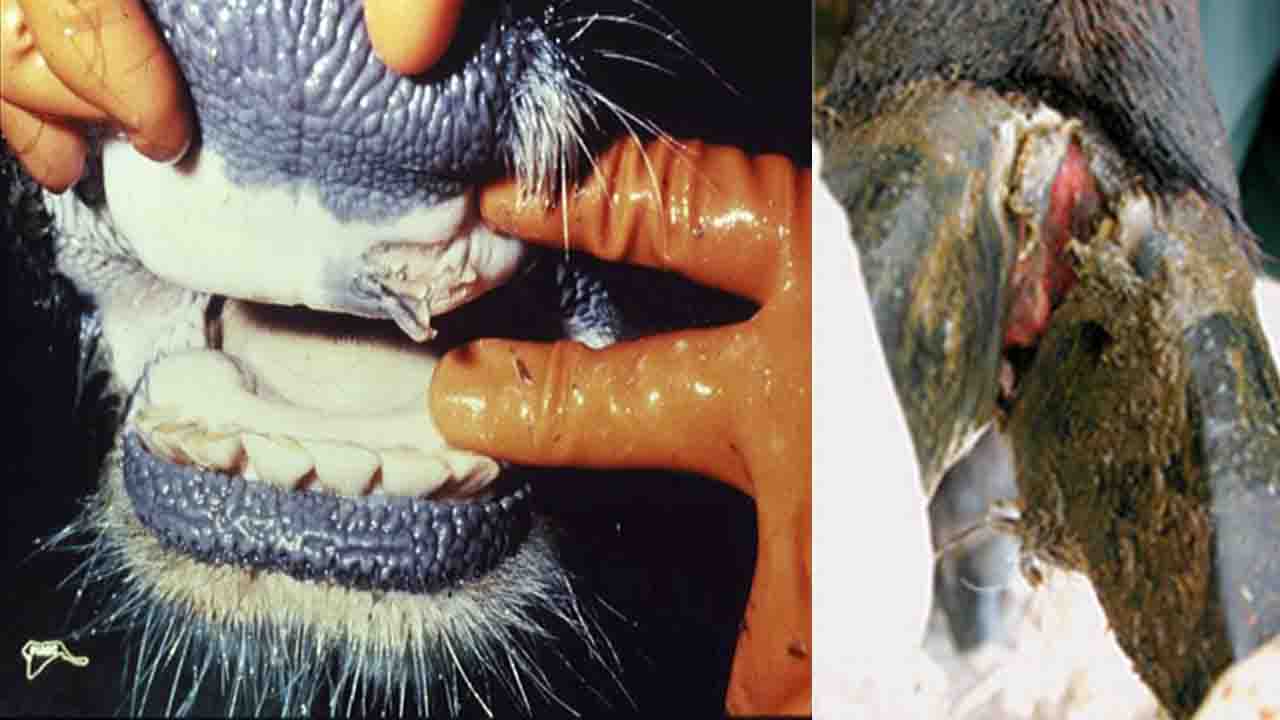 এফএমডি ভাইরাসের ইনকিউবেশন পিরিয়ড এক থেকে ১২ দিনের মধ্যে থাকে। এই রোগের বৈশিষ্ট্য হলো উচ্চ জ্বর যা দুই থেকে তিন দিন পর দ্রুত কমে যায়, মুখের ভিতরে ফোসকা যা থেকে আঁশযুক্ত বা ফেনাযুক্ত লালা এবং লালা ঝরার পরিমাণ বেড়ে যায়, এবং পায়ে ফোসকা যা ফেটে গিয়ে খোঁড়া হওয়ার কারণ হতে পারে। প্রাপ্তবয়স্ক প্রাণীদের ওজন কমে যেতে পারে যা থেকে তারা কয়েক মাস ধরে সেরে ওঠে না, সেইসাথে পূর্ণবয়স্ক পুরুষ প্রাণীর অণ্ডকোষে ফোলাভাব দেখা দেয় এবং গরুর দুধ উৎপাদন উল্লেখযোগ্যভাবে কমে যেতে পারে। যদিও বেশিরভাগ প্রাণী শেষ পর্যন্ত এফএমডি থেকে সেরে ওঠে, এই রোগ মায়োকার্ডাইটিস (হৃদপেশীর প্রদাহ) এবং মৃত্যুর কারণ হতে পারে, বিশেষ করে নবজাতক প্রাণীদের ক্ষেত্রে। কিছু সংক্রমিত রোমন্থক প্রাণী উপসর্গবিহীন বাহক হিসাবে থাকে, কিন্তু তারা ভাইরাস বহন করে এবং অন্যদের মধ্যে এটি ছড়িয়ে দিতে সক্ষম হতে পারে। শূকর উপসর্গবিহীন বাহক হিসেবে কাজ করতে পারে না।