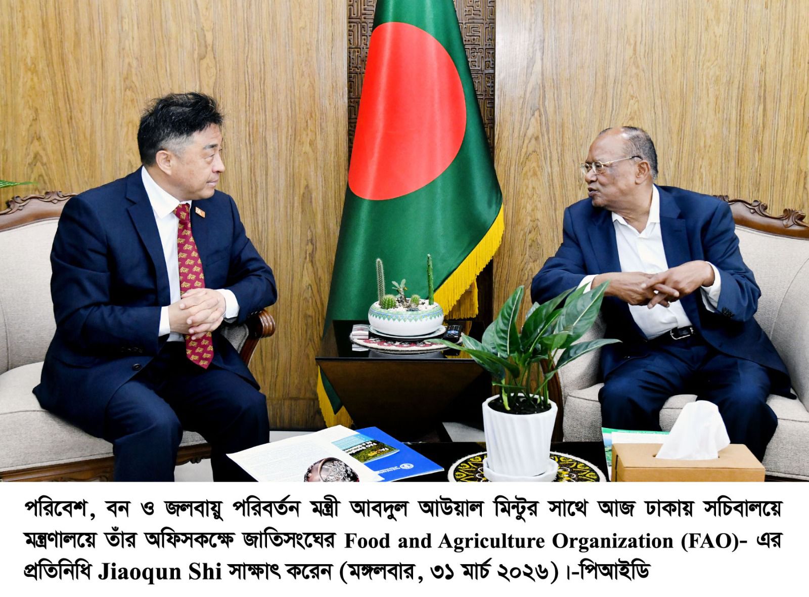 ঢাকা, ১৭ চৈত্র (৩১ মার্চ): পরিবেশ, বন ও জলবায়ু পরিবর্তন মন্ত্রী আবদুল আউয়াল মিন্টুর সাথে আজ বাংলাদেশ সচিবালয়ে তাঁর দপ্তরে বাংলাদেশে নিযুক্ত জাতিসংঘের খাদ্য ও কৃষি সংস্থার (এফএও) প্রতিনিধি মি. জিয়াওকুন শি সাক্ষাৎ করেছেন। এ সময় পরিবেশ, বন ও জলবায়ু পরিবর্তন মন্ত্রণালয়ের সচিব মো. রায়হান কাওছার উপস্থিত ছিলেন।