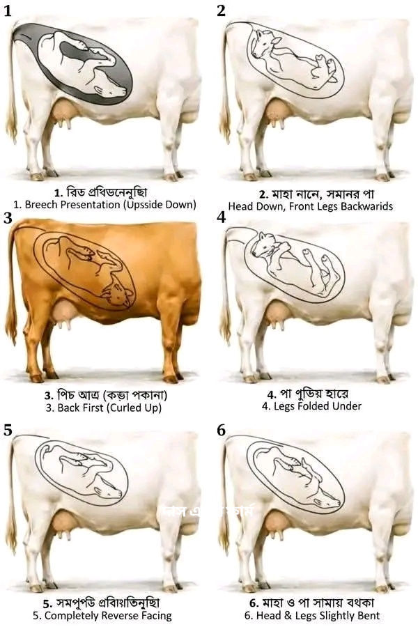 একজন সচেতন খামারি হিসেবে গাভীর প্রসবকালীন সময়ে বাছুরের অবস্থান সম্পর্কে পরিষ্কার ধারণা থাকা জরুরি। নিচের ছবিতে বাছুরের ৬টি ভিন্ন ভিন্ন পজিশন নম্বর দিয়ে ব্যাখ্যা করা হলো: